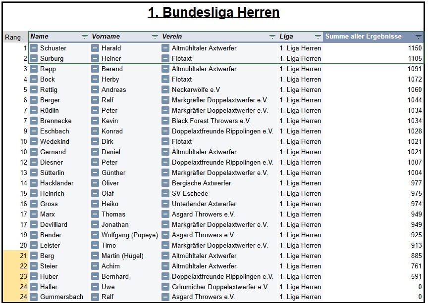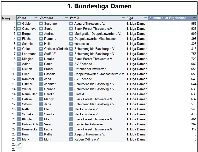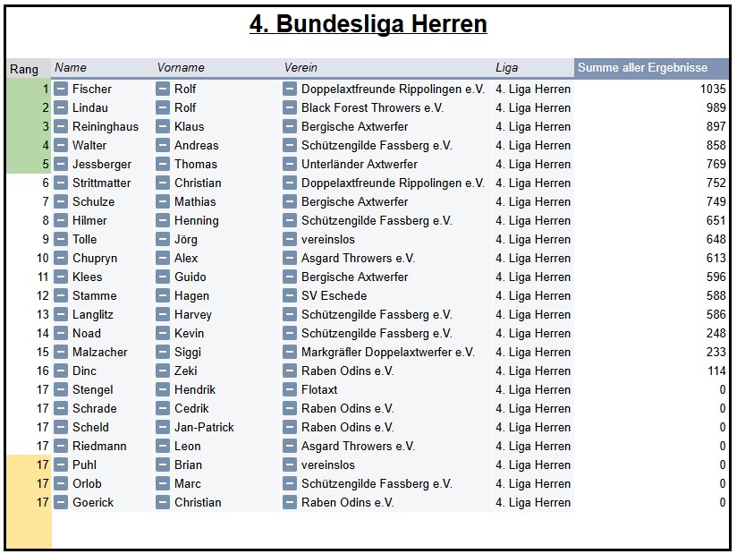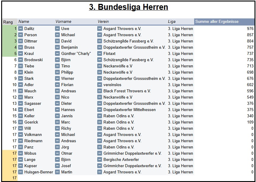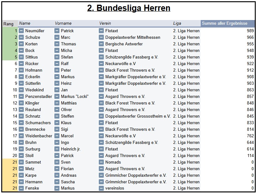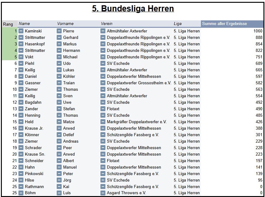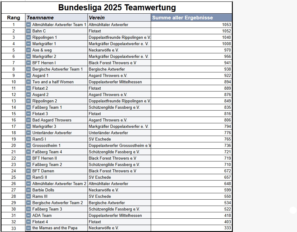 Die aktuelle Bundesliga-Saison des Verbands Deutscher Doppelaxtwerfer (VDDAW) begann am 01. März 2025 und endete am 30. September 2025. Die Regeln für die Bundesliga-Saison 2025 können hier nachgelesen werden.
